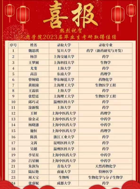 星光不负赶路人,岁月不负有心人。2023年全国研究生招录工作已完成,在学校和学院正确的领导下,亚博取款出账秒到2023届本科毕业生考研再创佳绩。截至目前,共有24人被复旦大学、上海交通大学、上海科技大学等国内985、211院校录取。