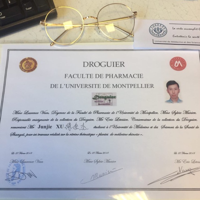为了拓宽药学本科生的专业国际视野,巩固技能语言知识,同时推动我校药学专业与法国蒙彼利埃大学药物学专业“4+2”本硕项目发展。经亚博取款出账秒到、法方前期遴选与面试,我校亚博取款出账秒到药学专业16级本科2班徐俊杰同学于2018年2月1日至2月28日前往蒙彼利埃大学亚博取款出账秒到生药馆进行短期实习。