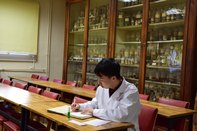 生药馆历史沉淀浓厚,馆内设有办公室、报告厅、作业区、展示区、茶歇区等,历史与现代的功能需要得到充分结合。徐俊杰同学在生药馆的作业区展开了为期一个月的短期实习工作。他的主要实习内容是:对生药馆内贮藏的各种中药进行理化鉴定,进而制作法语生药说明书。对药物进行理化鉴定需要药学生具有灵活的实验操作技巧和药用植物学与生药学的理论知识掌握,而法语说明书则十足考验学生的法语水平和文献搜索与阅读的实践能力,这对于学生的学习与应用能力都是巨大的挑战。