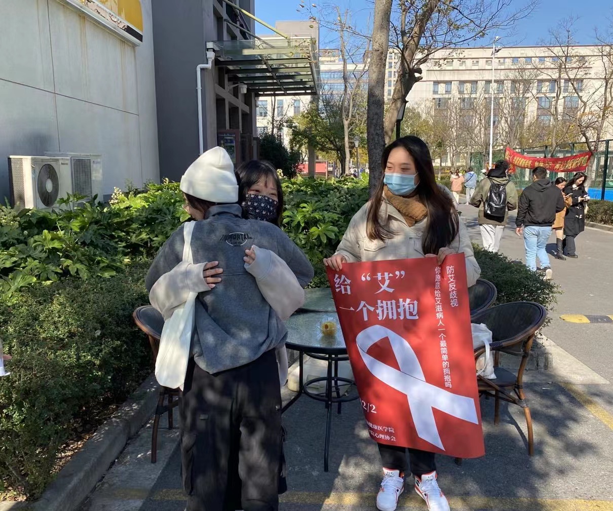 多一份理解与关怀,少一份歧视与冷漠。生理的痛苦、来自外界的歧视与不解,对于艾滋病患者都是致命一击。艾滋病固然是一种可怕的疾病,但并不是不可防治,一个简单的拥抱、一个善意的微笑、一句真挚的祝福就能给艾滋病患者带来温暖,告诉他们并不是孤立无援。感谢每一位主动拥抱的同学,让 “生命至上、终结艾滋”的理念和“健康平等”的人文关怀在校园中不断流动。(薛诗雯)
