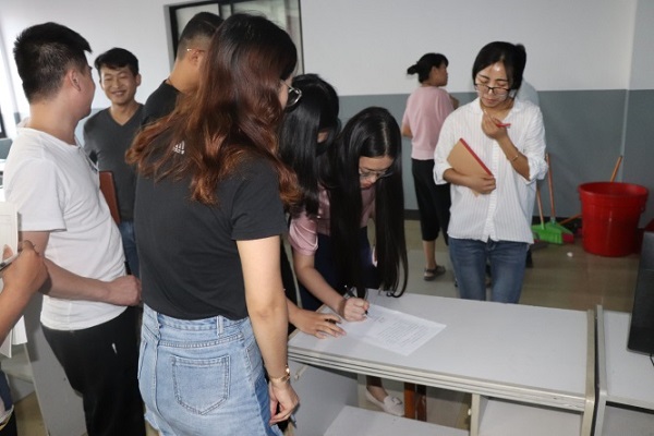 活动由教学科长肖媛媛主持。首先,肖老师带领全体教师宣读承诺书。宣读完毕后,所有老师都在承诺书下签上了自己的姓名。