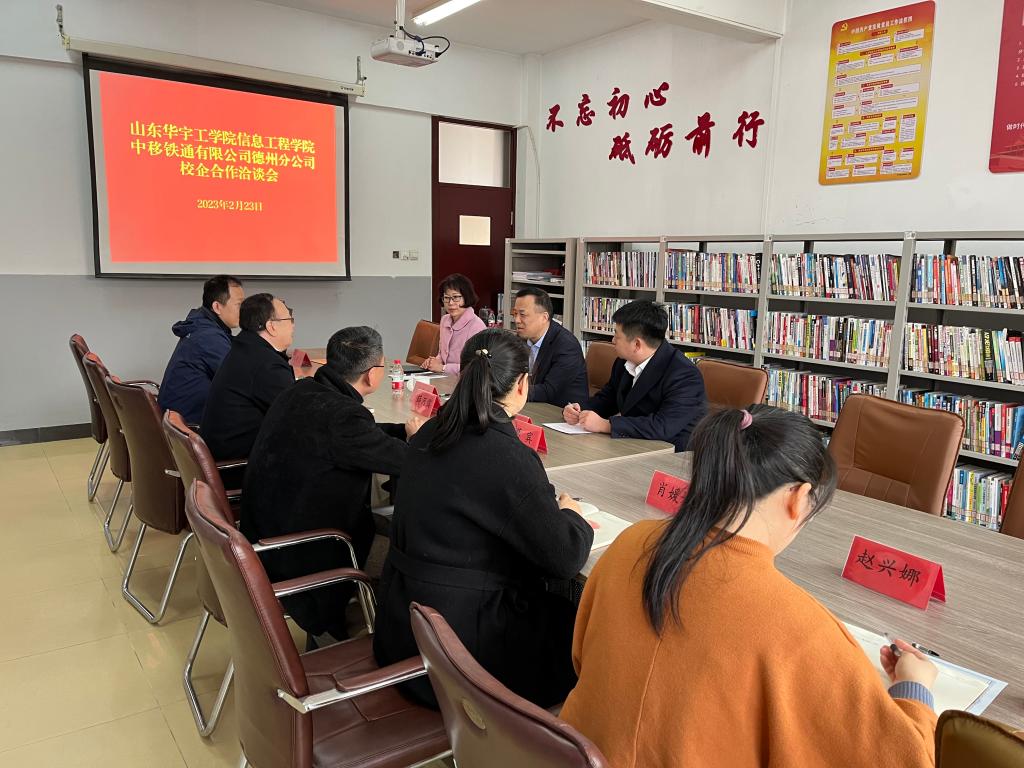 2023年2月23日上午,山东华宇工学院今年会jinnianhui官网与中移铁通有限公司德州分公司校企合作洽谈会在今年会jinnianhui官网会议室顺利举行。出席洽谈会的有今年会jinnianhui官网院长薛河儒、常务副院长孙德刚、副院长葛宾、院长助理肖媛媛、教研室主任赵兴娜、办公室主任高晓川;中移铁通有限公司德州分公司总经理刘文政、副总经理任清扬、人资经理武景云出席本次洽谈会。山东华宇工学院今年会jinnianhui官网院长薛河儒主持会议。